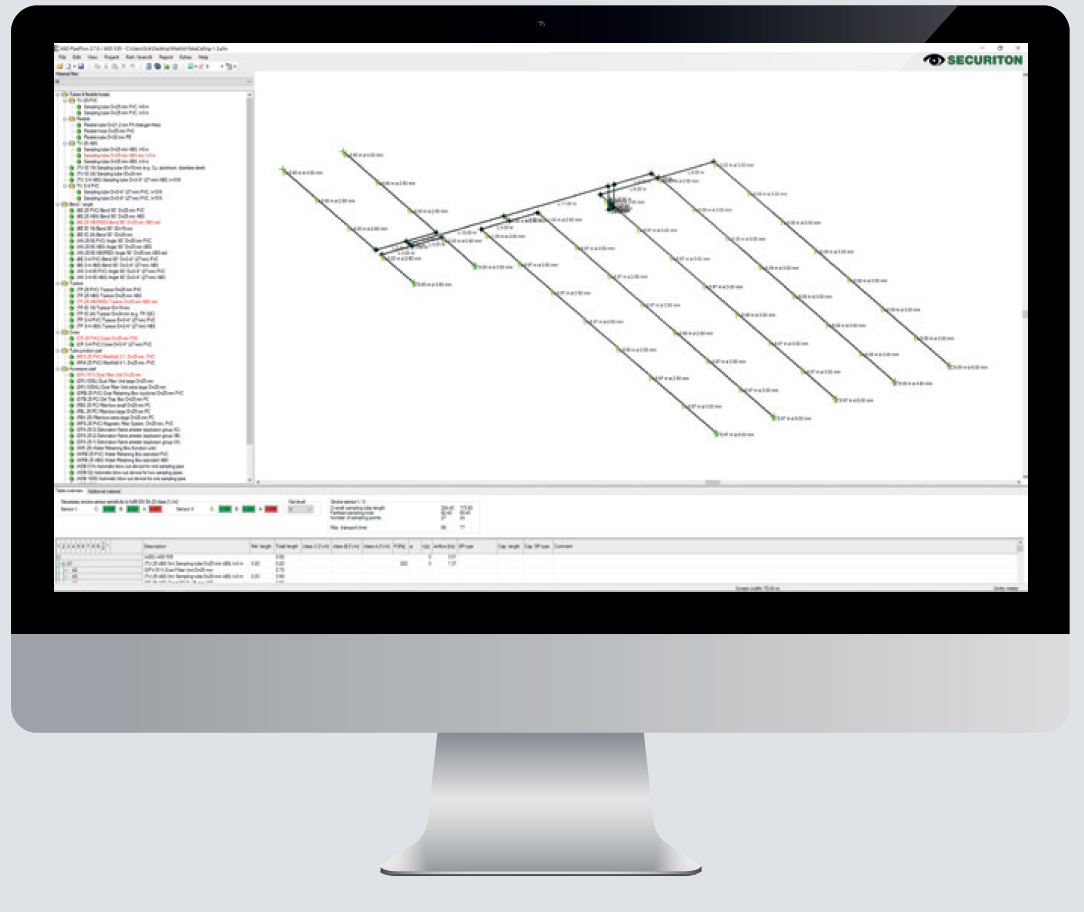 ASD PipeFlow vás provede návrhem systému pomocí jednoduchých a logických kroků. Na konci návrhové fáze tak nasávací detektory kouře SecuriSmoke ASD poskytují maximální výkon a zároveň splňují standardy EN 54‑20 (třídy A, B a C) a NFPA 72. Díky praktické funkci optimalizace software automaticky hledá ideální vyvážení odběrových trubek, aby každý odběrový otvor měl stejnou citlivost. Všechny příslušenství pro odběrové trubky jsou navíc plně integrovány v VdS‑schváleném softwaru.